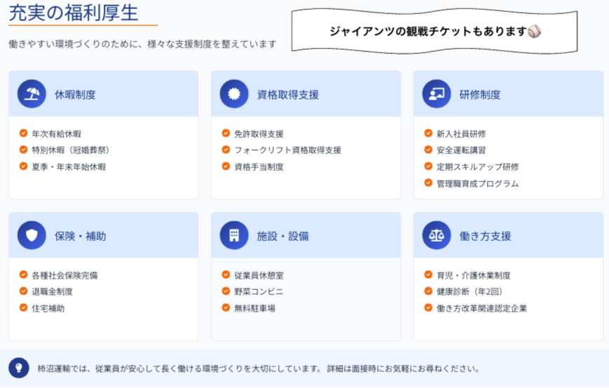 入社時に免許がなくても、研修や支援制度を通じて一人前のドライバーへと成長できる環境を整えています。未経験の方や、社会人経験が浅い方でも心配はいりません。新卒・中途に関わらず、一人ひとりのペースに寄り添いながら、確実にプロへと導きます。また、家賃補助や免許取得支援、年間休日120日など、働きやすさにもこだわっています。社員が安心して長く働ける職場であることが、私たちの品質や信頼につながると考えているからです。