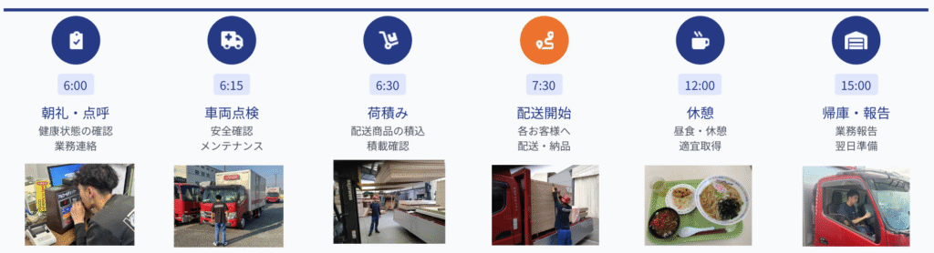 6:00 | 出社、点呼、車両点検、荷積み準備 |